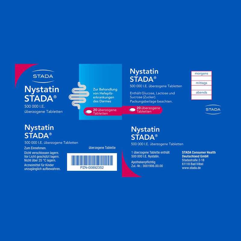 Nystatin STADA® 500.000 I.E. überzogene Tabletten Wirkstoff: Nystatin. Zur topischen intestinalen Behandlung nachgewiesener nystatinempfindlicher Hefepilzinfektionen, insbesondere als Folge einer Therapie mit Antibiotika, Zytostatika oder Kortikoiden. Enthält Glucose, Lactose und Sucrose (Zucker). Zu Risiken und Nebenwirkungen lesen Sie die Packungsbeilage und fragen Sie Ihren Arzt und Apotheker. STADAPHARM GmbH, Stadastraße 2-18, 61118 Bad Vilbel. Stand: Juli 2020