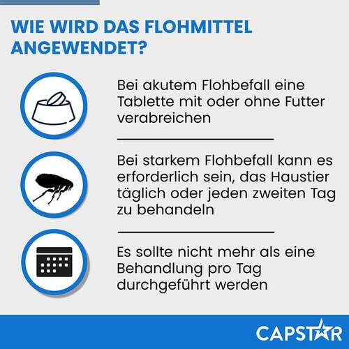 Eine CAPSTAR™ Tablette je Tier wird – optimalerweise mit dem Futter (davor oder direkt nach der Fütterung) verabreicht. In der Regel reicht die Behandlung mit nur einer Tablette bei akutem Flohbefall aus. Eine Wiederholungsbehandlung kann bei schwerem Flohbefall notwendig sein. Für eine dauerhafte Vorbeugung gegen Flöhe empfiehlt sich ein Produkt mit Langzeitwirkung.