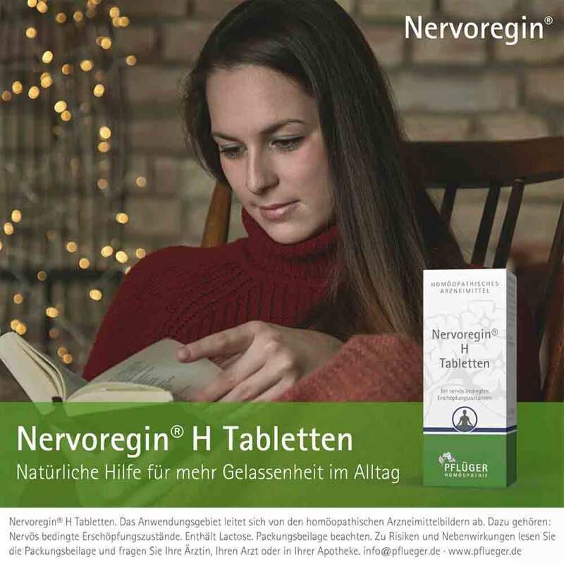 Nervoregin® H Tabletten. Zusammensetzung 1 Tablette enthält: Wirkstoffe: Acidum phosphoricum Dil. D 1 0,16 mg, Anamirta cocculus Trit. D 3 10,0 mg, Avena sativa Urt. 20,0 mg, Hypericum perforatum Trit. D 1 10,0 mg, Passiflora incarnata Urt. 10,0 mg. Sonstige Bestandteile: Calciumbehenat (DAB), Kartoffelstärke, Lactose-Monohydrat. Das Anwendungsgebiet leitet sich von den homöopathischen Arzneimittelbildern ab. Dazu gehören: Nervös bedingte Erschöpfungszustände. Gegenanzeigen: Überempfindlichkeit gegen Hafer. Nervoregin® H Tabletten enthalten Johanniskraut (Hypericum perforatum). Bei Lichtüberempfindlichkeit kann es in seltenen Fällen zu Hautreaktionen kommen. Nebenwirkungen: Keine bekannt. Tabletten enthalten Lactose. Packungsbeilage beachten. Zu Risiken und Nebenwirkungen lesen Sie die Packungsbeilage und fragen Sie Ihre Ärztin, Ihren Arzt oder in Ihrer Apotheke. Homöopathisches Laboratorium Alexander Pflüger GmbH & Co. KG | 33378 Rheda Wiedenbrück | info@pflueger.de | www.pflueger.de