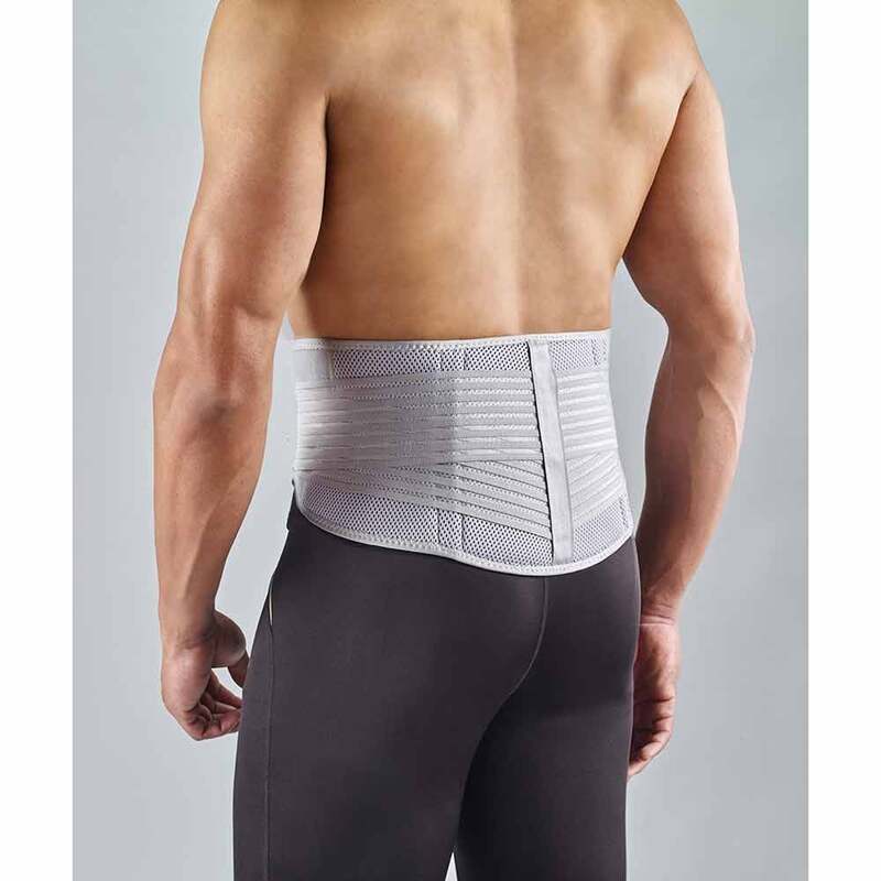 - Öffnen Sie die Laschen der Hauptbandage und lösen Sie die Laschen der Gürtelbandage. Legen Sie die Bandage so um den Lendenbereich, dass sich die Pelotten an beiden Seiten der Wirbelsäule befinden und der gebogene Rand unten ist.