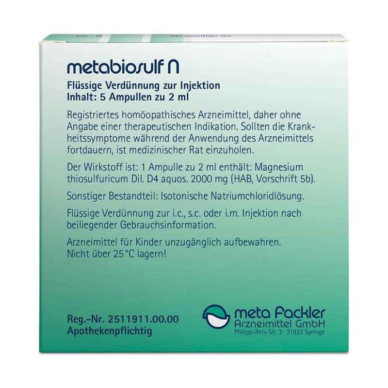 Pflichtangaben:Metabiosulf N Injektionslösung.Registriertes homöopathisches Arzneimittel, daher ohne Angabe einer therapeutischen Indikation. Sollten Krankheitssymptome während der Anwendung des Arzneimittels fortdauern, ist medizinischer Rat einzuholen. Zu Risiken und Nebenwirkungen lesen Sie die Packungsbeilage und fragen Sie Ihre Ärztin, Ihren Arzt oder in Ihrer Apotheke.