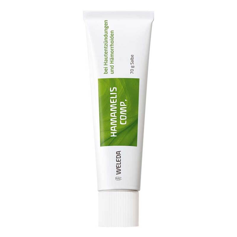 Hamamelis comp. Warnhinweis: Enthält Sesamöl, Wollwachs, Butylhydroxytoluol – bitte Packungsbeilage beachten. Gemäß der anthroposophischen Menschen- und Naturerkenntnis. Dazu gehören: Deformierende chronisch-entzündliche Veränderungen der Haut, insbesondere an der Haut-Schleimhaut-Grenze, z.B. Ekzeme, Geschwürbildungen (Ulzerationen), Schrunden (Rhagaden), Hämorrhoiden. Dosierung und Art der Anwendung Die Salbe mehrmals täglich auf die betroffenen Stellen auftragen oder als Salbenverband anwenden. Zur Anwendung als Salbenverband wird ein sauberes Stück Leinen- oder Baumwollstoff dünn mit der Salbe bestrichen, mit der Salbenseite über den betroffenen Stellen aufgelegt und befestigt. Nicht bei Kindern unter 12 Jahren anwenden. Zu Risiken und Nebenwirkungen lesen Sie die Packungsbeilage und fragen Sie Ihre Ärztin, Ihren Arzt oder in Ihrer Apotheke. Weleda AG, Schwäbisch Gmünd