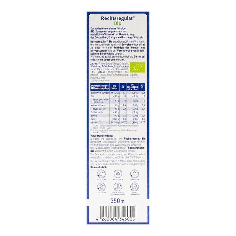 Rechtsregulat Bio ist ein kaskadenfermentiertes flüssiges Konzentrat aus frischen, ökologisch angebauten Früchten, Nüssen und Gemüse. Es enthält Aminosäuren, Oligopeptide, sekundäre Pflanzenstoffe, rechtsdrehende Milchsäure und Zellwandbestandteile der Milchsäurebakterien (Peptidoglykane).