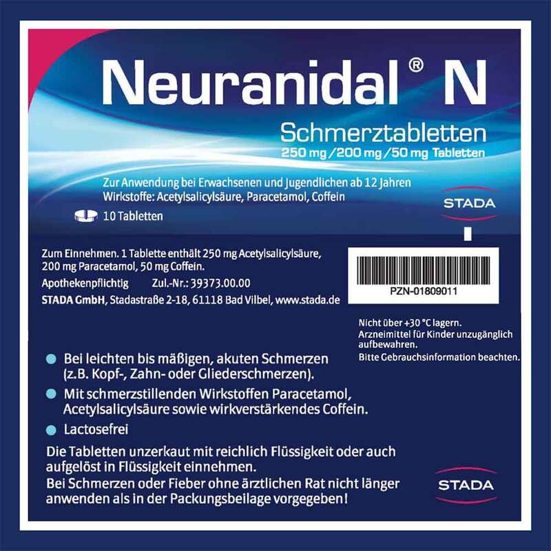 Neuranidal® N Schmerztabletten 250 mg/200 mg/50 mg Tabletten Wirkstoffe: Acetylsalicylsäure, Paracetamol, Coffein. Für Erwachsene und Jugendliche ab 12 Jahren bei akuten leichten bis mäßig starken Schmerzen. Hinweis: Bei Schmerzen oder Fieber ohne ärztlichen Rat nicht länger an-wenden als in der Packungsbeilage vorgegeben! Zu Risiken und Nebenwirkungen lesen Sie die Packungsbeilage und fragen Sie Ihre Ärztin, Ihren Arzt oder in Ihrer Apotheke. STADA Consumer Health Deutschland GmbH, Stadastraße 2–18, 61118 Bad Vilbel Stand: März 2024