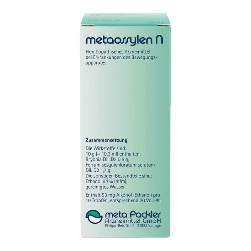 Pflichtangaben:metaossylen N Mischung. Wirkstoffe: Bryonia Dil. D2, Ferrum sesquichloratum solutum Dil. D2 Die Anwendungsgebiete leiten sich von den homöopathischen Arzneimittelbildern ab. Dazu gehören: Akuter und chronischer Rheumatismus mit schmerzhafter Schulter. Hinweis: Bei akuten Gelenkbeschwerden, die z. B. mit Rötung, Schwellung oder Überwärmung einhergehen sowie bei anhaltenden, unklaren oder neu auftretenden Beschwerden sollte ein Arzt aufgesucht werden. Enthält 53 mg Alkohol (Ethanol) pro 10 Tropfen, entsprechen 20 Vol.-%. Zu Risiken und Nebenwirkungen lesen Sie die Packungsbeilage und fragen Sie Ihre Ärztin, Ihren Arzt oder in Ihrer Apotheke. meta Fackler Arzneimittel GmbH, D-31832 Springe.