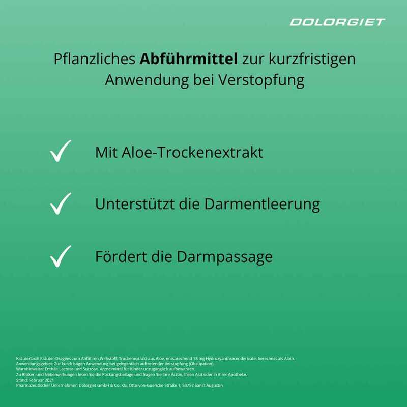 Pflichtangaben:Kräuterlax® Kräuter-Dragées zum Abführen. Wirkstoff: Aloe-Trockenextrakt. Anwendungsgebiet: Pflanzliches Arzneimittel zur kurzfristigen Anwendung bei gelegentlich auftretender Verstopfung. Warnhinweise: Enthält Lactose und Sucrose. Arzneimittel für Kinder unzugänglich aufbewahren. Zu Risiken und Nebenwirkungen lesen Sie die Packungsbeilage und fragen Sie Ihre Ärztin, Ihren Arzt oder in Ihrer Apotheke. Stand: Februar 2021. Dolorgiet GmbH & Co. KG, Otto-von-Guericke-Straße 1, 53757 Sankt Augustin.
