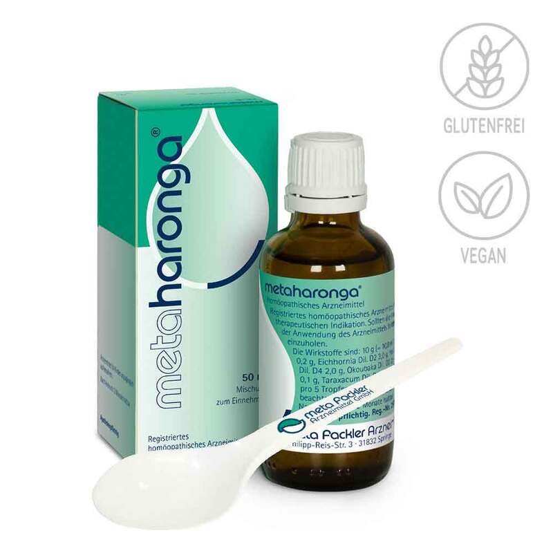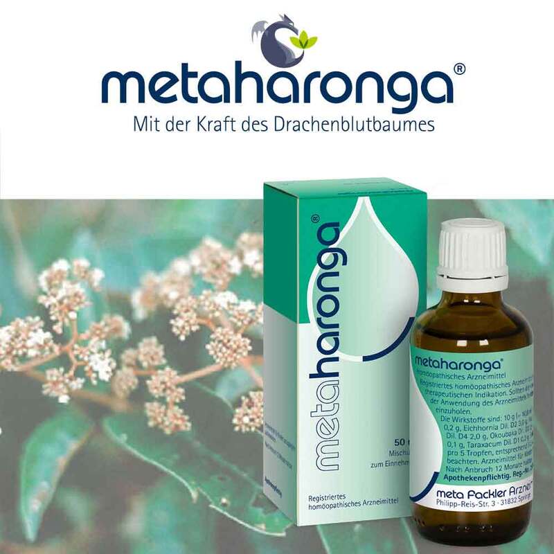 Pflichtangaben:metaharonga® Mischung.Anwendungsgebiete: Registriertes homöopathisches Arzneimittel, daher ohne Angabe einer therapeutischen Indikation. Enthält 54 mg Alkohol (Ethanol) pro 5 Tropfen, entsprechend 51,5 Vol.-%. Zu Risiken und Nebenwirkungen lesen Sie die Packungsbeilage und fragen Sie Ihre Ärztin, Ihren Arzt oder in Ihrer Apotheke. meta Fackler Arzneimittel GmbH, D-31832 Springe.