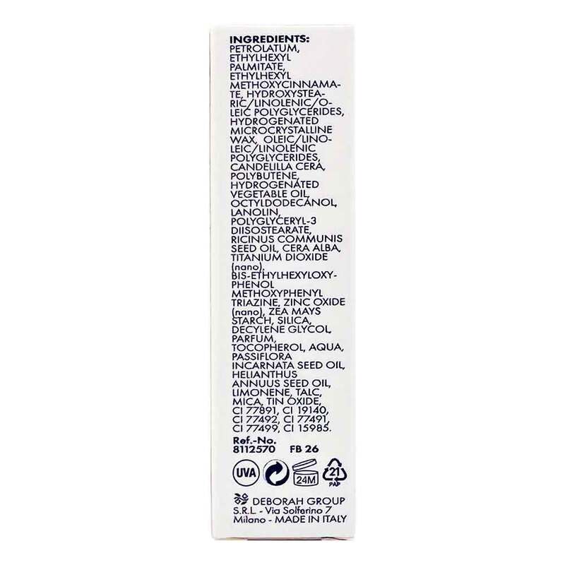 PETROLATUM, ETHYLHEXYL PALMITATE, ETHYLHEXYL METHOXYCINNAMATE, HYDROXYSTEARIC/LINOLENIC/OLEIC POLYGLYCERIDES, HYDROGENATED MICROCRYSTALLINE WAX, OLEIC/LINOLEIC/LINOLENIC POLYGLYCERIDES, CANDELILLA CERA, POLYBUTENE, HYDROGENATED VEGETABLE OIL, OCTYLDODECANOL, LANOLIN, POLYGLYCERYL-3 DIISOSTEARATE, RICINUS COMMUNIS SEED OIL, CERA ALBA, TITANIUM DIOXIDE (nano), BIS-ETHYLHEXYLOXYPHENOL METHOXYPHENYL TRIAZINE, ZINC OXIDE (nano), ZEA MAYS STARCH, SILICA, DECYLENE GLYCOL, PARFUM, TOCOPHEROL, AQUA, PASSIFLORA INCARNATA SEED OIL, HELIANTHUS ANNUUS SEED OIL, LIMONENE, TALC, MICA, TIN OXIDE, CI 77891, CI 19140, CI 77492, CI 77491, CI 77499, CI 15985.