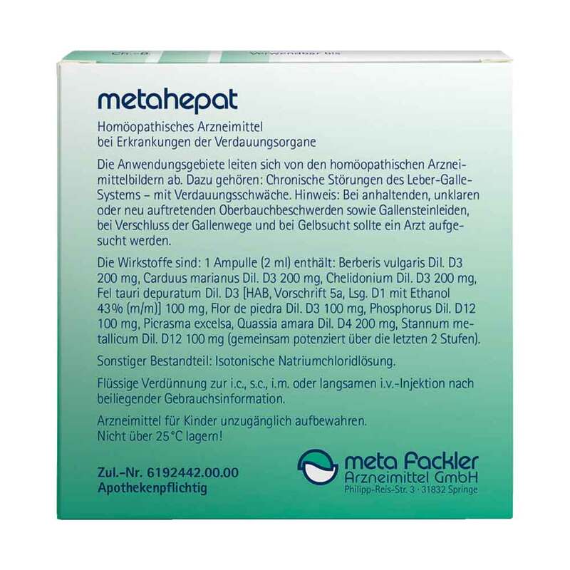 Pflichtangaben:Metahepat InjektionslösungMetahepat Flüssige Verdünnung zur Injektion enthält eine Kombination homöopathischer Einzelmittel, die sich in ihren Anwendungsgebieten und ihren Arzneimittelbildern sinnvoll ergänzen. Zu Risiken und Nebenwirkungen lesen Sie die Packungsbeilage und fragen Sie Ihre Ärztin, Ihren Arzt oder in Ihrer Apotheke. meta Fackler Arzneimittel GmbH, D-31832 Springe.