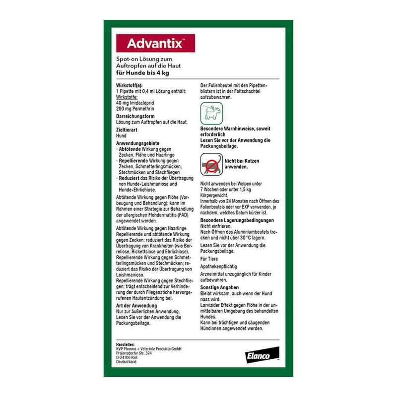 Advantix Spot-On Lösung zum Auftropfen auf die Haut für Hunde Wirkstoffe: Imidacloprid, Permethrin. Anwendungsgebiete: Zur Behandlung und Vorbeugung des Flohbefalls (Ctenocephalides felis, Ctenocephalides canis) und zur Behandlung des Haarlingbefalls (Trichodectes canis) beim Hund. Die am Hund befindlichen Flöhe werden innerhalb eines Tages nach Behandlung abgetötet. Eine einmalige Behandlung bietet vier Wochen lang Schutz vor erneutem Flohbefall. Das Tierarzneimittel kann im Rahmen einer Strategie zur Behandlung der durch Flohstiche hervorgerufenen allergischen Flohdermatitis (FAD) angewendet werden. Das Tierarzneimittel hat eine anhaltend abtötende und repellierende Wirkung gegen Zecken (Rhipicephalus sanguineus und Ixodes ricinus über vier Wochen und Dermacentor recticulatus für drei Wochen). Durch die repellierende Wirkung und die Abtötung der Vektorzecke Rhipicephalus sanguineus reduziert das Tierarzneimittel die Wahrscheinlichkeit der Übertragung des Krankheitserregers Ehrlichia canis und vermindert auf diese Weise das Risiko für eine monozytäre Ehrlichiose beim Hund. Das verminderte Risiko wurde durch Untersuchungen beginnend vom dritten Tag nach der Anwendung des Tierarzneimittels über einen Zeitraum von vier Wochen nachgewiesen. Es ist möglich, dass Zecken, die zum Zeitpunkt der Behandlung bereits am Hund vorhanden sind, nicht innerhalb von 2 Tagen nach Behandlung getötet werden und angeheftet und sichtbar bleiben. Deshalb sollten die Zecken zum Behandlungszeitpunkt entfernt werden, um ein Anheften und Blutsaugen zu verhindern. Eine einmalige Behandlung bietet eine repellierende (anti feeding = die Blutmahlzeit verhindernde) Wirkung gegen Schmetterlingsmücken (Phlebotomus papatasi für zwei Wochen und Phlebotomus perniciosus für drei Wochen), gegen Stechmücken (Aedes aegypti für zwei Wochen und Culex pipiens für vier Wochen) und gegen Stechfliegen (Stomoxys calcitrans für vier Wochen). Zur Verringerung des Infektionsrisikos durch den von Sandmücken (Phlebotomus perniciosus) übertragenen Erreger Leishmania infantum über einen Zeitraum von bis zu 3 Wochen. Dieser Effekt beruht auf der indirekten Wirkung des Tierarzneimittels gegen den Vektor. Warnhinweise: Nicht bei Katzen anwenden. Advantix ist ein Tierarzneimittel. Zu Risiken und Nebenwirkungen lesen Sie die Packungsbeilage und fragen Sie Ihre Tierärztin, Ihren Tierarzt oder in Ihrer Apotheke. DE: Apothekenpflichtig. AT: Rezeptfrei, Apothekenpflichtig. Zulassungsinhaber: DE: Elanco GmbH, 27472 Cuxhaven, Deutschland. AT: Elanco Animal Health GmbH, 40789 Monheim, Deutschland April 2023