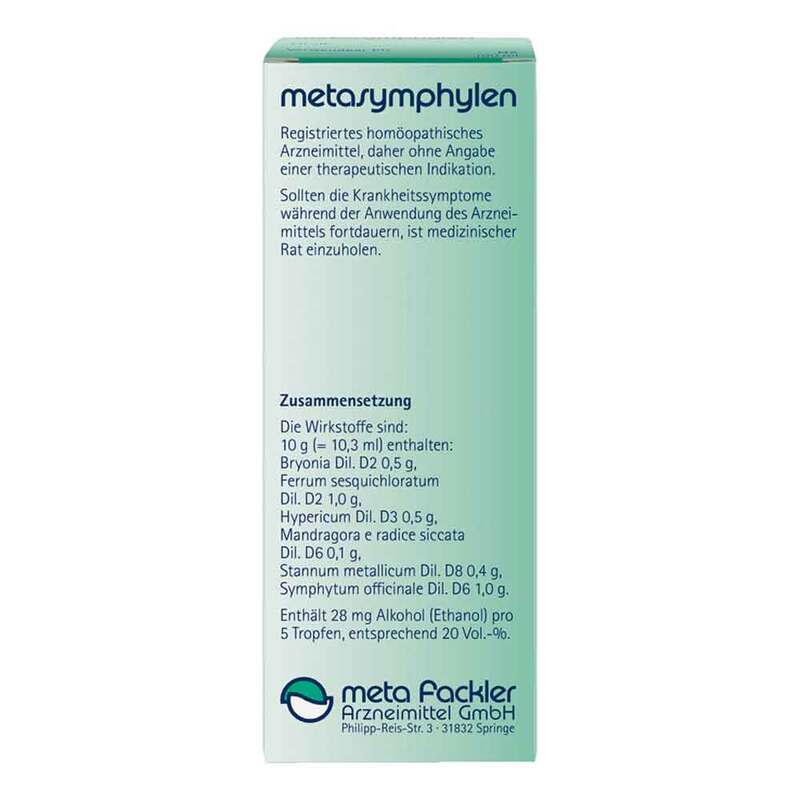 Metasymphylen Mischung. Anwendungsgebiete: Registriertes homöopathisches Arzneimittel, daher ohne Angabe einer therapeutischen Indikation. Enthält 28 mg Alkohol (Ethanol) pro 5 Tropfen, entsprechend 20 Vol.-%. Zu Risiken und Nebenwirkungen lesen Sie die Packungsbeilage und fragen Sie Ihre Ärztin, Ihren Arzt oder in Ihrer Apotheke. meta Fackler Arzneimittel GmbH, D-31832 Springe.