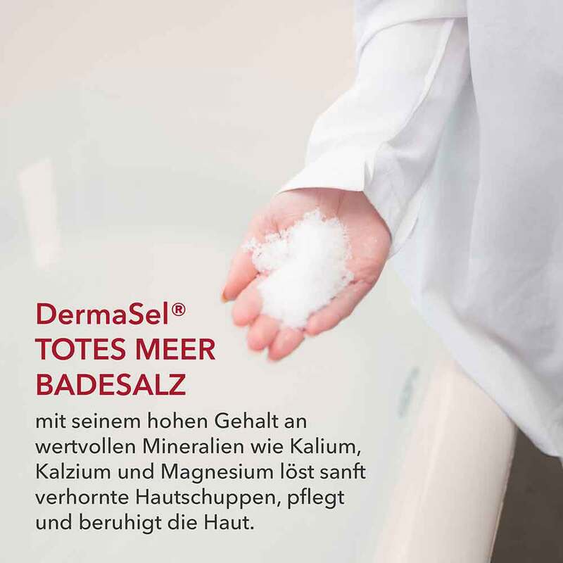 Das TOTES MEER Salz für die Badewanne. Schon in der Antike galt es als entspannend, gesundheitsfördernd und hilfreich bei verschiedensten Hautproblemen. DermaSel® TOTES MEER BADESALZ mit seinem hohen Gehalt an wertvollen Mineralien wie Kalium, Kalzium und Magnesium löst sanft verhornte Hautschuppen, pflegt und beruhigt die Haut.