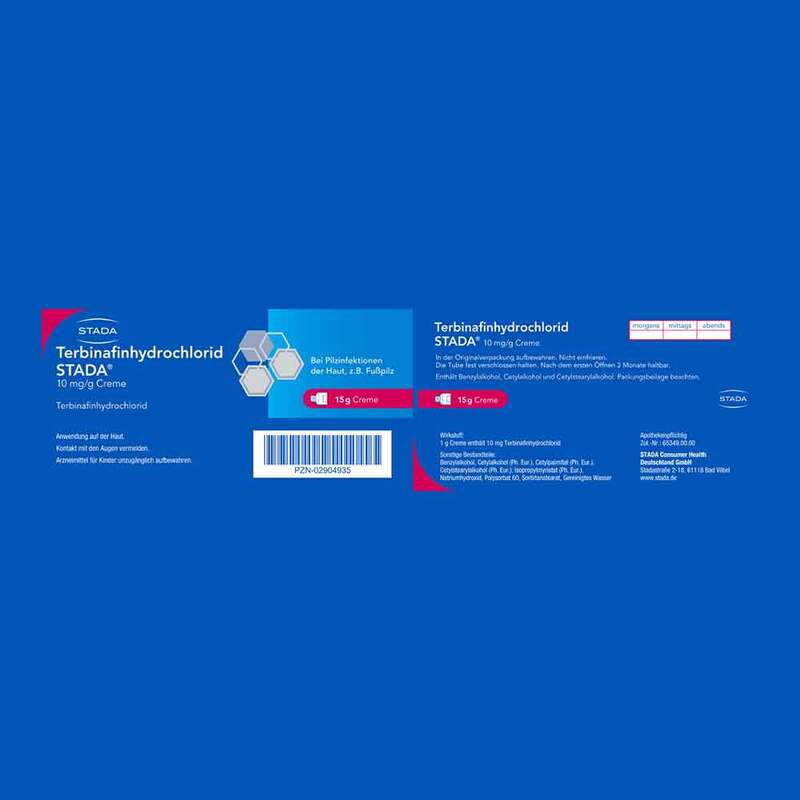 Terbinafinhydrochlorid STADA® 10 mg/g Creme. Wirkstoff: Terbinafinhydrochlorid. Zur Anwendung gegen bestimmte Hefen und Hautpilze, von denen der Fußpilz der bekannteste ist. Enthält Benzylalkohol, Cetylalkohol und Cetylstearylalkohol. Zu Risiken und Nebenwirkungen lesen Sie bitte die Packungsbeilage und fragen Sie Ihren Arzt oder Apotheker. STADA Consumer Health Deutschland GmbH, Stadastraße 2-18, 61118 Bad Vilbel. Stand: August 2020
