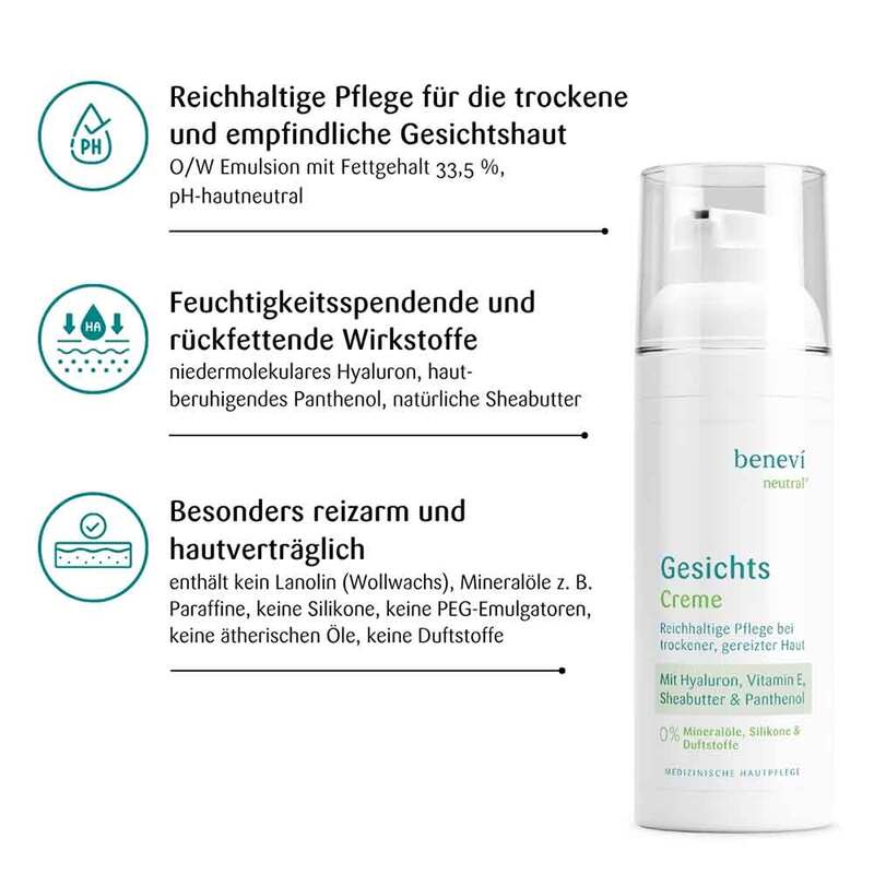 Die Benevi neutral Gesichts-Creme stärkt mit einem hohen Lipidanteil die Hautbarriere und beugt damit Hautreizungen vor.