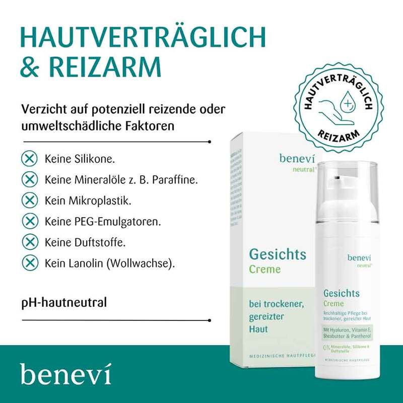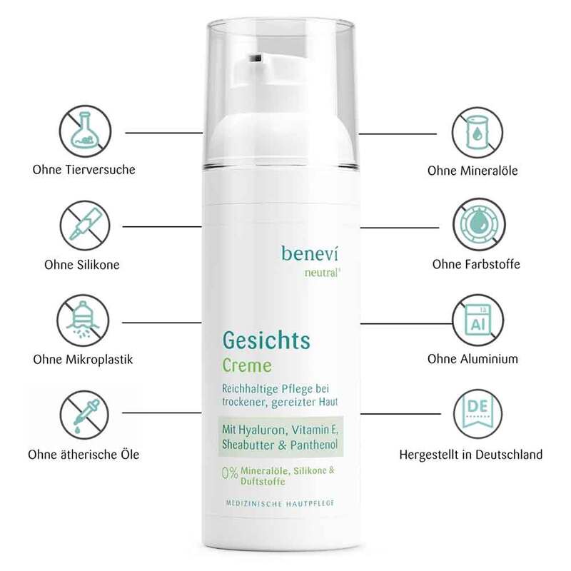 Wie alle Benevi neutral-Produkte verzichtet auch die Gesichts-Creme auf belastende Zusätze wie Duft- und Farbstoffe, PEG-Emulgatoren, Mineralöle und Silikone.