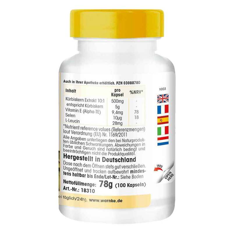 Kürbiskernextrakt (10:1), Gelatine (Hilfsstoff), D-alpha-Tocopherol, Selenhefe, Magnesiumstearat (pflanzlich) (Hilfsstoff), Siliciumdioxid (Hilfsstoff)Aufbewahrungshinweise