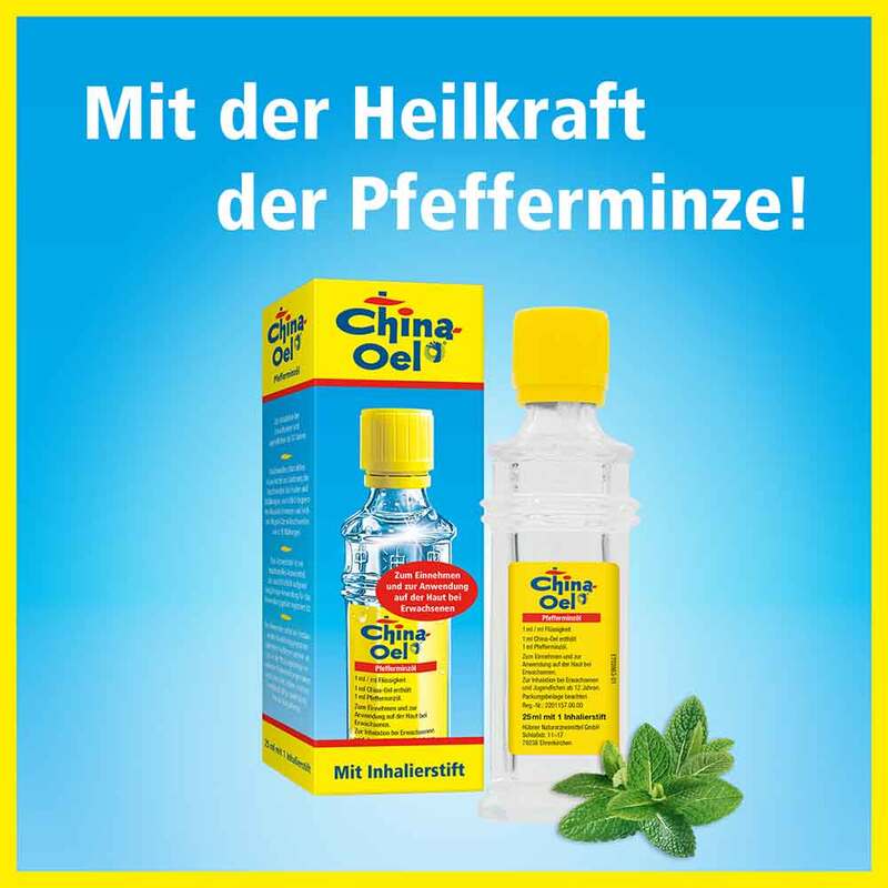 China-Oel® Wirkstoff: Pfefferminzöl. Anwendungsgebiete: Äußere Anwendung: Traditionelles pflanzliches Arzneimittel zur Linderung der Beschwerden bei Husten und Erkältungen; Traditionelles pflanzliches Arzneimittel zur Linderung von örtlich begrenzten Muskelschmerzen. Inhalation: Traditionelles pflanzliches Arzneimittel zur Linderung der Beschwerden bei Husten und Erkältungen. Innere Anwendung: Traditionelles pflanzliches Arzneimittel zur Linderung leichter Magen-Darm-Beschwerden wie z. B. Blähungen. Das Arzneimittel ist ein traditionelles Arzneimittel, das ausschließlich aufgrund langjähriger Anwendung für das Anwendungsgebiet registriert ist. Warnhinweis: Der Anwender sollte bei fortdauernden Krankheitssymptomen von mehr als 1 Woche oder beim Auftreten anderer als der in der Packungsbeilage erwähnten Nebenwirkungen einen Arzt oder eine andere in einem Heilberuf tätige qualifizierte Person konsultieren. Zu Risiken und Nebenwirkungen lesen Sie die Packungsbeilage und fragen Sie Ihre Ärztin, Ihren Arzt oder in Ihrer Apotheke. Stand 03/2023. Hübner Naturarzneimittel GmbH, 79238 Ehrenkirchen.