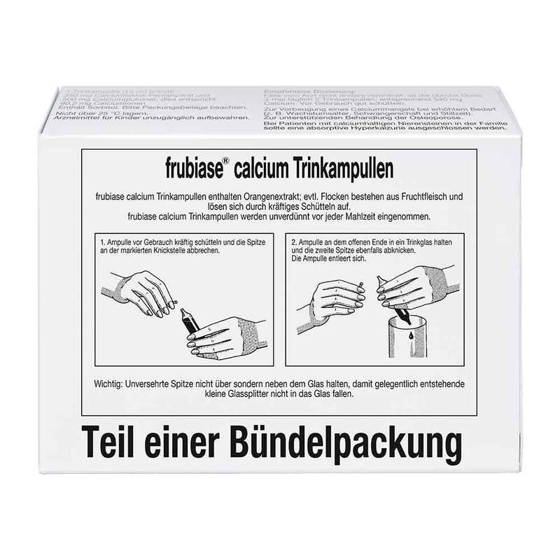 frubiase® calcium Trinkampullen 350 mg/500 mg pro 10 ml Wirkstoffe: Calciumlaktat-Pentahydrat und Calciumglukonat. Zur Vorbeugung eines Calciummangels bei Erwachsenen, wenn die tägliche Calciumaufnahme über die Nahrung nicht ausreichend ist. Zur unterstützenden Behandlung der Osteoporose. Hinweis: Enthält Benzylakohol und Sorbitol. Enthält 1,49 mg Alkohol (Ethanol) pro Trinkampulle (10 ml). Zu Risiken und Nebenwirkungen lesen Sie die Packungsbeilage und fragen Sie Ihre Ärztin, Ihren Arzt oder in Ihrer Apotheke. STADA Consumer Health Deutschland GmbH, Stadastraße 2-18, 61118 Bad Vilbel Stand: Mai 2022