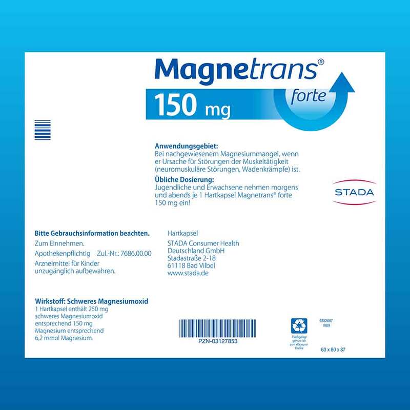Magnetrans® forte 150 mg Hartkapseln Wirkstoff: Schweres Magnesiumoxid. Bei nachgewiesenem Magnesiummangel, wenn er Ursache für Störungen der Muskeltätigkeit (neuromuskuläre Störungen, Wadenkrämpfe) ist. Zu Risiken und Nebenwirkungen lesen Sie die Packungsbeilage und fragen Sie Ihre Ärztin, Ihren Arzt oder in Ihrer Apotheke. STADA Consumer Health Deutschland GmbH, Stadastraße 2–18, 61118 Bad Vilbel Stand: April 2025