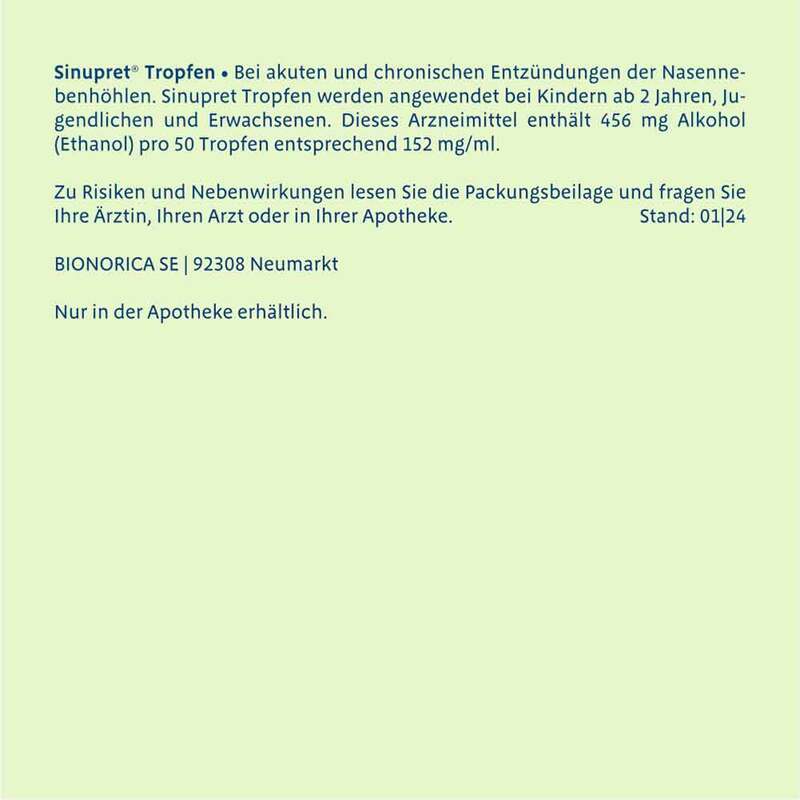 Sinupret® Tropfen Bei akuten und chronischen Entzündungen der Nasennebenhöhlen. Sinupret Tropfen werden angewendet bei Kindern ab 2 Jahren, Jugendlichen und Erwachsenen. Dieses Arzneimittel enthält 456 mg Alkohol (Ethanol) pro 50 Tropfen entsprechend 152 mg/ml. Zu Risiken und Nebenwirkungen lesen Sie die Packungsbeilage und fragen Sie Ihre Ärztin, Ihren Arzt oder in Ihrer Apotheke. BIONORICA SE | 92318 Neumarkt Mitvertrieb: PLANTAMED Arzneimittel GmbH | 92318 Neumarkt Nur in der Apotheke erhältlich. Stand: 09|25