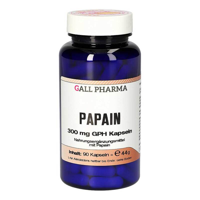 Papain 300 mg GPH Kapseln enthalten 300 mg Papain mit einer Aktivität von mindestens 2,5 FIP-Einheiten/mg in einer Cellulosekapsel. FIP-Einheiten sind von der Internationalen Pharmazeutischen Vereinigung (Fédération Internationale Pharmaceutique) definierte spezielle Einheiten für Enzyme. Papain aus der Papaya kann durch seine eiweißaufspaltende Fähigkeit als natürliche und wertvolle Verdauungshilfe dienen, indem es die Aufspaltung eiweißreicher Nahrungsbestandteile im Verdauungsprozess sowohl im sauren als auch im alkalischen Bereich erleichtert und die Funktion körpereigener Verdauungsenzyme unterstützt. Es vermag Stoffwechselvorgänge anzuregen und kann als unterstützende Maßnahme zur Gewichtsreduktion beitragen. Zudem kann Papain nach sportlichem Training, übermäßiger Muskelbeanspruchung oder Schwellungszuständen nach Operationen Mechanismen im Körper in Gang setzen, die die Regeneration günstig beeinflussen.