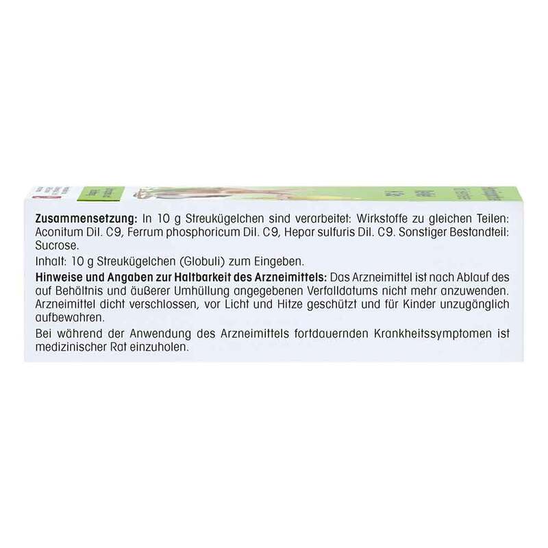 Die Streukügelchen enthalten zu gleichen Teilen: Aconitum C9, Ferrum phosphoricum C9, Hepar sulfuris C9