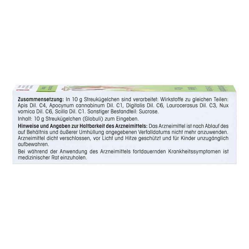 Die Streukügelchen enthalten zu gleichen Teilen: Apis C4, Apocynum cannabinum C1, Digitalis C6, Laurocerasus C3, Nux vomica C6, Scilla C1