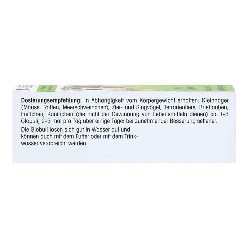 In Abhängigkeit vom Körpergewicht erhalten: Kleinnager (Mäuse, Ratten, Meerschweinchen), Zier- und Singvögel, Terrarientiere, Brieftauben, Frettchen, Kaninchen (die nicht der Gewinnung von Lebensmitteln dienen) ca. 1 bis 3 Globuli, 2- bis 3-mal pro Tag über einige Tage; bei zunehmender Besserung seltener.