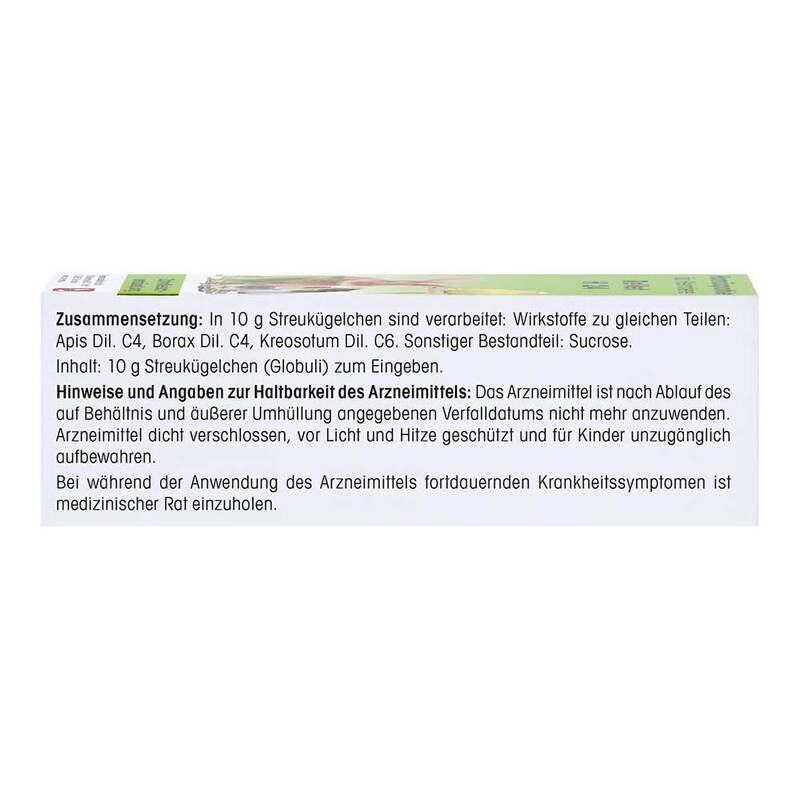 Die Streukügelchen enthalten zu gleichen Teilen Apis C4, Borax C4, Kreosotum C6