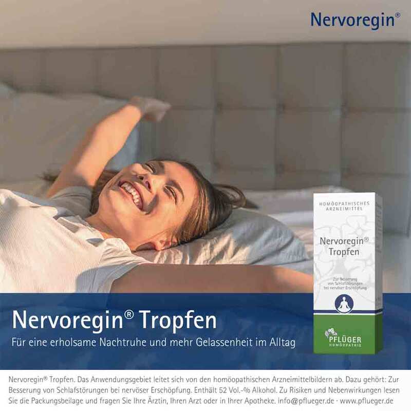 Nervoregin® Tropfen. Zusammensetzung: 10 g (= 10,7 ml) enthalten: Wirkstoffe: Acidum phosphoricum Dil. D 4 3,0 g, Avena sativa Urt. 3,0 g, Humulus lupulus Urt. 1,0 g, Passiflora incarnata Dil. D 2 3,0 g. Bestandteile 1 und 4 über die letzte Stufe gemeinsam potenziert. Das Anwendungsgebiet leitet sich von den homöopathischen Arzneimittelbildern ab. Dazu gehört: Zur Besserung von Schlafstörungen bei nervöser Erschöpfung. Gegenanzeigen/Nebenwirkungen: keine bekannt. Enthält 52 Vol.-% Alkohol. Zu Risiken und Nebenwirkungen lesen Sie die Packungsbeilage und fragen Sie Ihre Ärztin, Ihren Arzt oder in Ihrer Apotheke. Homöopathisches Laboratorium Alexander Pflüger GmbH & Co. KG | 33378 Rheda-Wiedenbrück | info@pflueger.de | www.pflueger.de