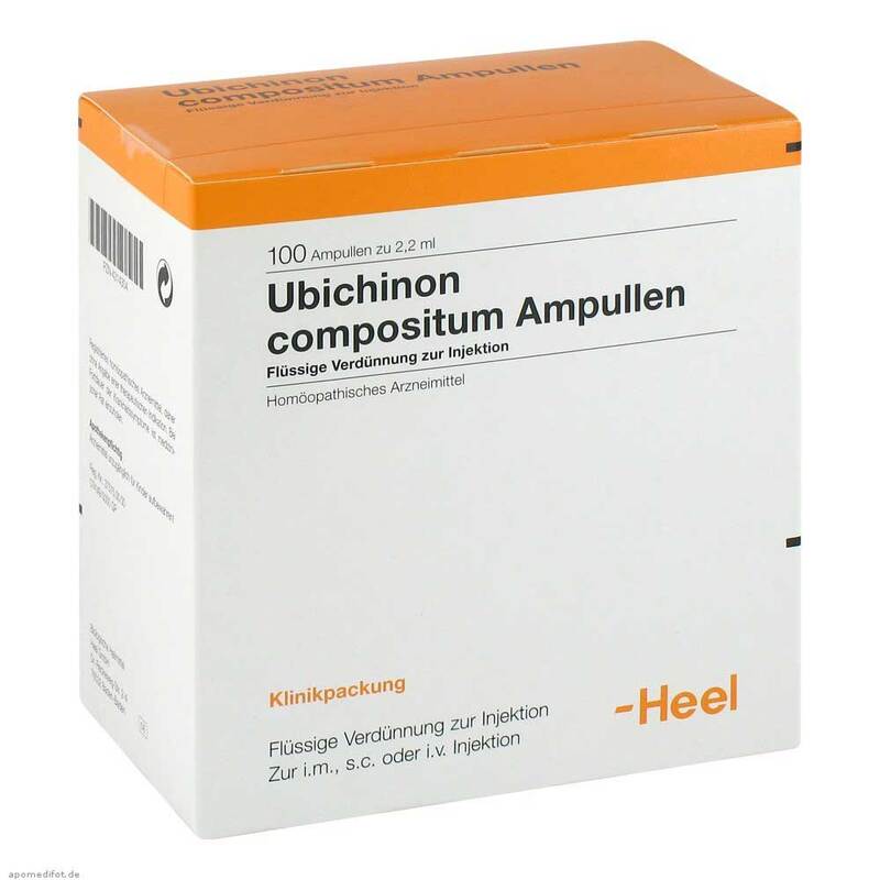 1 Ampulle zu 2,2 ml (= 2,2 g) enthält: Wirkstoffe: Acidum ascorbicum Dil. D6 (HAB, Vorschrift 5a, Lsg. D1 mit Ethanol 15% (m/m)) 22 mg, Thiaminum hydrochloricum Dil. D6 (HAB,Vorschrift 5a, Lsg. D1 mit Wasser) 22 mg, Natrium riboflavinum phosphoricum Dil. D6 (HAB, Vor- schrift 5a, Lsg. D2 mit Wasser) 22 mg, Pyridoxinum hydrochloricum Dil. D6 (HAB, Vorschrift 5a, Lsg. D1 mit Wasser) 22 mg, Nicotinamidum Dil. D6 (HAB, Vorschrift 5a, Lsg. D1 mit Ethanol 43% (m/m)) 22 mg, DE Ubichinon compositum Ampullen Flüssige Verdünnung zur Injektion Gebrauchsinformation 016061/5009 GP Vaccinium myrtillus Dil. D4 22 mg, Colchicum autumnale Dil. D4 22 mg, Podophyllum peltatum Dil. D4 22 mg, Conium maculatum Dil. D4 22 mg, Hydrastis canadensis Dil. D4 22 mg, Galium aparine Dil. D6 22 mg, Acidum L-(+)-lacticum Dil. D6 22 mg, Hydrochinonum Dil. D8 (HAB, Vorschrift 5a, Lsg. D1 mit Ethanol 43% (m/m)) 22 mg, Trichinoylum Dil. D10 (HAB, Vorschrift 6) 22 mg, Sulfur Dil. D8 22 mg, Anthrachinonum Dil. D10 (HAB, Vorschrift 6) 22 mg, Naphthochinonum Dil. D10 (HAB, Vorschrift 5a, Lsg. D2 mit Ethanol 86% (m/m)) 22 mg, para-Benzochinonum Dil. D10 (HAB, Vorschrift 5a, Lsg. D2 mit Ethanol 94% (m/m)) 22 mg, Ubidecarenonum Dil. D10 (HAB, Vorschrift 5a, Lsg. D3 mit absolutem Ethanol) 22 mg, Adenosinum triphosphoricum Dil. D10 (HAB, Vorschrift 5a, Lsg. D1 mit Wasser) 22 mg, Coenzym A Dil. D10 (HAB, Vorschrift 5a, Lsg. D2 mit Wasser) 22 mg, Acidum acetylosalicylicum Dil. D10 (HAB, Vorschrift 5a, Lsg. D1 mit Ethanol 86% (m/m)) 22 mg, Histaminum Dil. D10 (HAB, Vorschrift 5a, Lsg. D1 mit Ethanol 43% (m/m)) 22 mg, Nadidum Dil. D10 (HAB, Vorschrift 5a, Lsg. D2 mit Wasser) 22 mg, Magnesium gluconicum Dil. D10 (HAB, Vorschrift 5a, Lsg. D1 mit Wasser) 22 mg, Acidum thioc- ticum Dil. D8 aquos. (HAB, Vorschrift 6) 22 mg, Manganum phosphoricum Dil. D8 aquos. (HAB, Vorschrift 6) 22 mg, Natrium diethyloxalaceticum Dil. D8 aquos. (HAB, Vorschrift 6) 22 mg. Die Wirkstoffe 1 bis 25 werden über die letzten zwei Stufen gemeinsam potenziert. Sonstige Bestandteile: Wasser für Injektionszwecke, Natriumchlorid.
