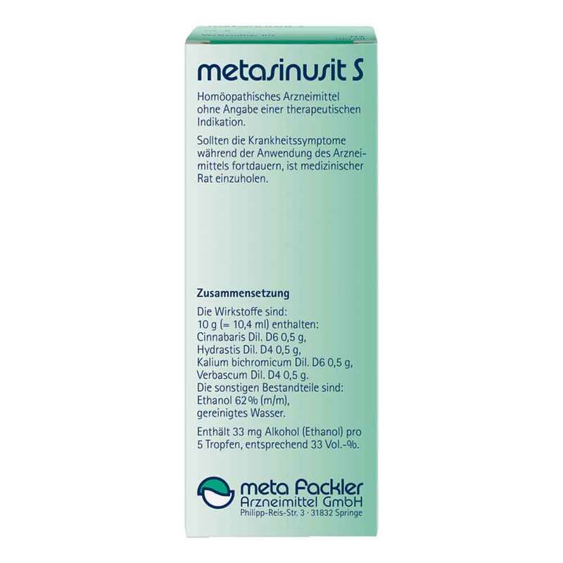 Pflichtangaben:metasinusit S Mischung.Anwendungsgebiete: Homöopathisches Arzneimittel, daher ohne Angabe einer therapeutischen Indikation. Enthält 33 mg Alkohol (Ethanol) pro 5 Tropfen, entsprechend 33 Vol.-%. Zu Risiken und Nebenwirkungen lesen Sie die Packungsbeilage und fragen Sie Ihre Ärztin, Ihren Arzt oder in Ihrer Apotheke. meta Fackler Arzneimittel GmbH, D-31832 Springe.