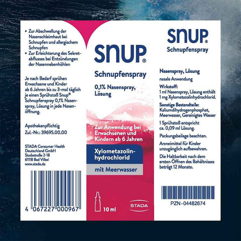 SNUP® Schnupfenspray 0,1 % NasensprayZur Anwendung bei Erwachsenen und Kindern ab 6 Jahren. Wirkstoff: Xylometazolinhydrochlorid. Zur Abschwellung der Nasenschleimhaut bei Schnupfen, anfallsweise auftretendem Fließschnupfen (Rhinitis vasomotorica), allergischem Schnupfen (Rhinitis allergica). Zur Erleichterung des Sekretabflusses bei Entzündung der Nasennebenhöhlen sowie bei Katarrh des Tubenmittelohrs in Verbindung mit Schnupfen. Zu Risiken und Nebenwirkungen lesen Sie die Packungsbeilage und fragen Sie Ihre Ärztin, Ihren Arzt oder in Ihrer Apotheke. STADA Consumer Health Deutschland GmbH, Stadastraße 2–18, 61118 Bad Vilbel Stand: März 2021