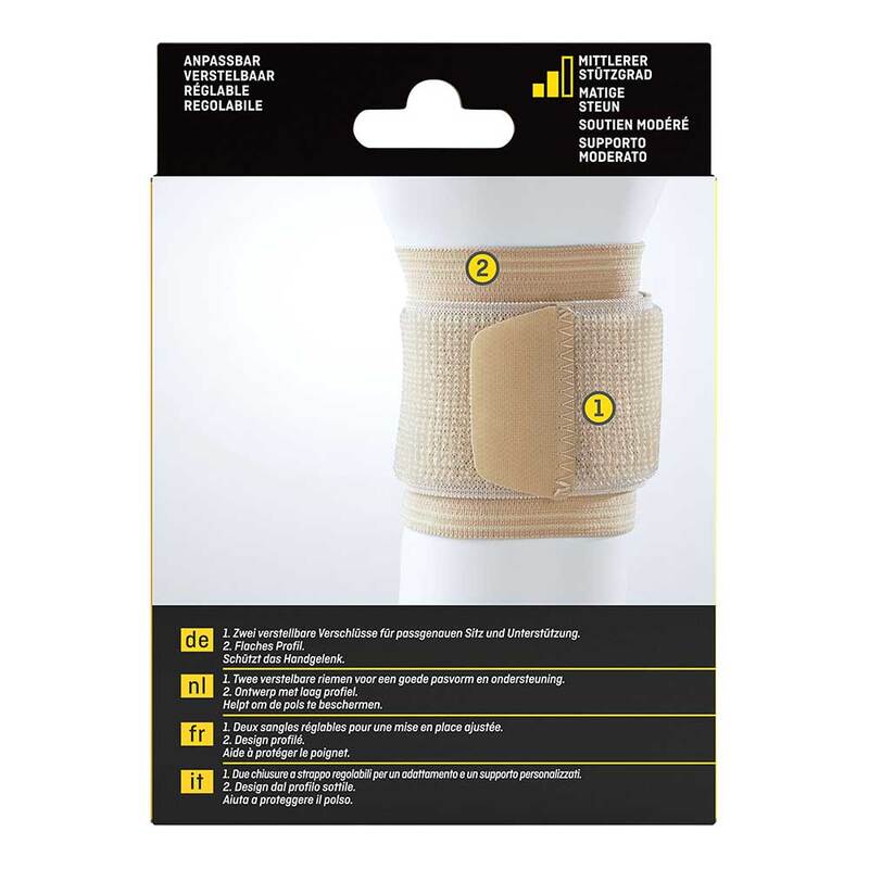 Die FUTURO™ Handgelenk-Bandage anpassbar stützt und schützt ein schwaches Gelenk. Die Handgelenk-Schiene besteht aus einer Gewebemischung mit Kompressionseffekt und begrenzt den Bewegungsumfang zugunsten einer moderaten Unterstützung. Zugleich dient ein Schaumstoffpolster als Stoßschutz.