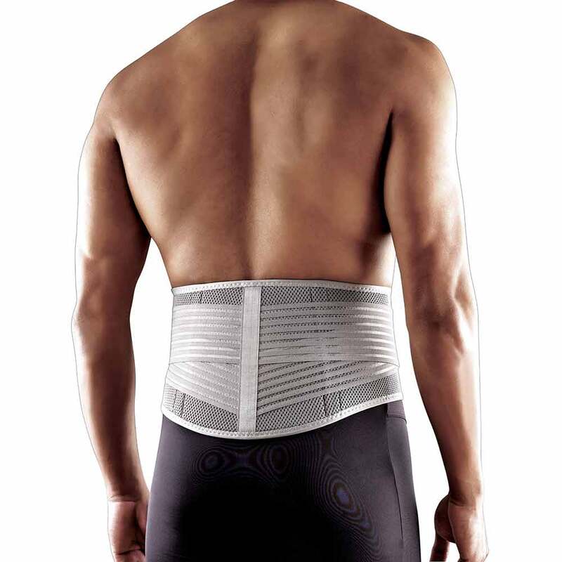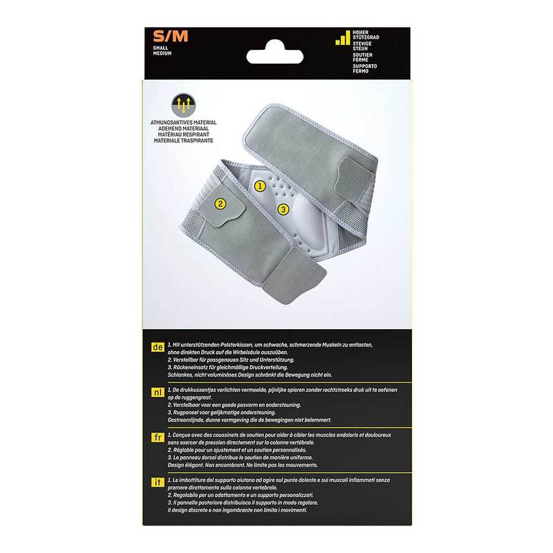 - Öffnen Sie die Laschen der Hauptbandage und lösen Sie die Laschen der Gürtelbandage. Legen Sie die Bandage so um den Lendenbereich, dass sich die Pelotten an beiden Seiten der Wirbelsäule befinden und der gebogene Rand unten ist.