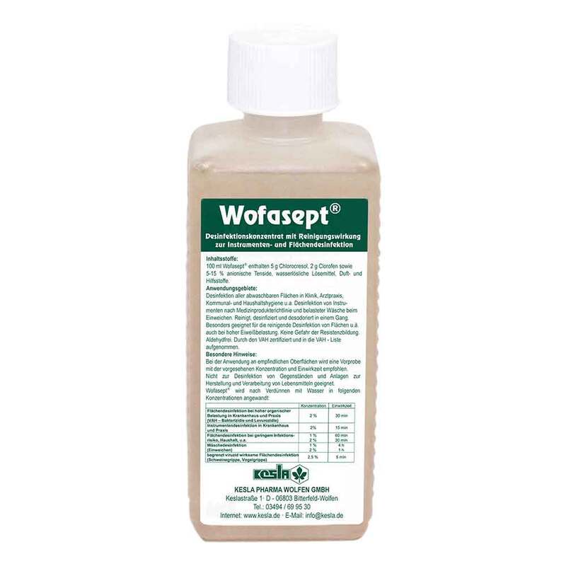 100 ml Wofasept enthalten: 5 g Chlorokresol, 2 g Clorofen sowie 5-15 % anionische Tenside, wasserlösliche Lösemittel, Duft- und Hilfsstoffe