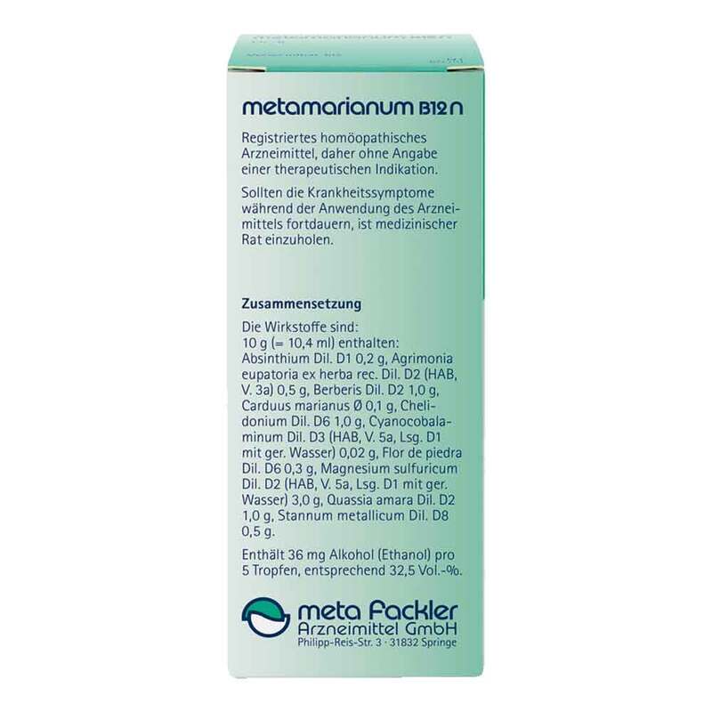 Pflichtangaben:metamarianum B12 N Mischung. Anwendungsgebiete: Registriertes homöopathisches Arzneimittel, daher ohne Angabe einer therapeutischen Indikation. Enthält 36 mg Alkohol (Ethanol) pro 5 Tropfen, entsprechend 32,5 Vol.-%. Zu Risiken und Nebenwirkungen lesen Sie die Packungsbeilage und fragen Sie Ihre Ärztin, Ihren Arzt oder in Ihrer Apotheke. meta Fackler Arzneimittel GmbH, D-31832 Springe.