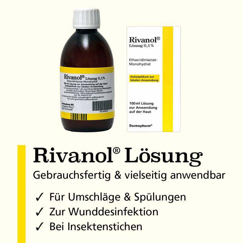 Rivanol® Lösung 0,1%/ Salbe/ 1,0 g Pulver Wirkstoff: Ethacridinlactat-Monohydrat Anwendungsgebiete: Zur lokalen Anwendung als Antiseptikum. Pulver: zum Auflösen in Wasser; in wässriger Lösung lokal als Antiseptikum. Stand: 03/2018 Zu Risiken und Nebenwirkungen lesen Sie die Packungsbeilage und fragen Sie Ihre Ärztin, Ihren Arzt oder in Ihrer Apotheke.