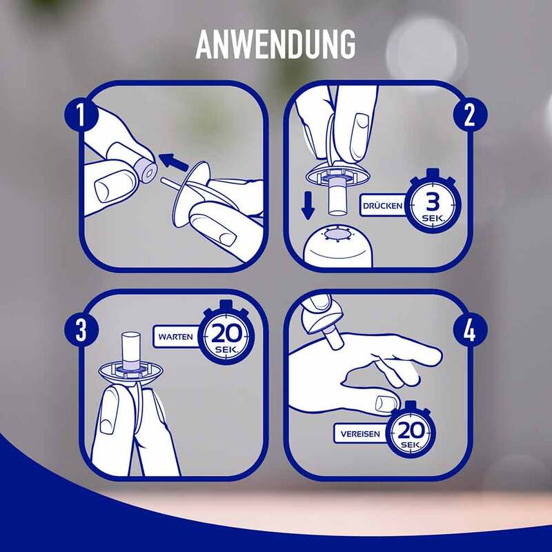 Nehmen Sie den Schaumstoffapplikator und schieben diesen über den Stift des Plastikhalters. Drücken Sie den Halter 3 Sekunden lang in die Öffnung der Spraydose und warten Sie danach 20 Sekunden lang um die richtige Vereisungstemperatur zu erzielen.