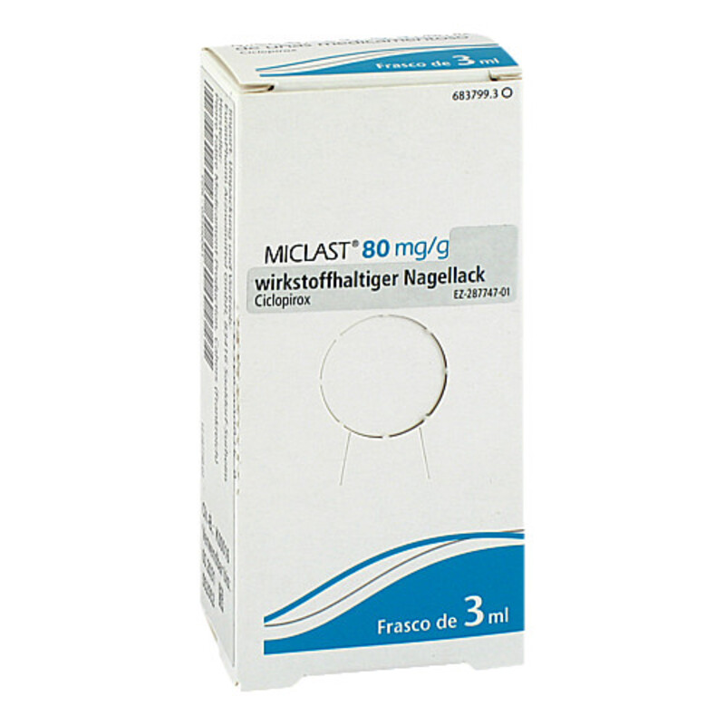 MICLAST® 80 mg/g wirkstoffhaltiger Nagellack. Wirkstoff: Ciclopirox. Anwendungsgebiet: Behandlung von leichtem bis mittelschwerem Nagelpilz-Befall (Onychomykose) der Finger- und Zehennägel. Der Wirkstoff Ciclopirox dringt in den Nagel ein und tötet die Pilze ab. Zu Risiken und Nebenwirkungen lesen Sie die Packungsbeilage und fragen Sie Ihre Ärztin, Ihren Arzt oder in Ihrer Apotheke.