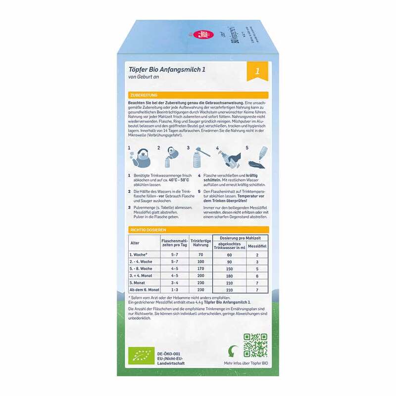 Für die Zähne ist häufiger oder dauernder Kontakt mit kohlenhydrathaltigen Nahrungen schädlich. Dieser kann schwere Zahnschäden (Karies) verursachen. Wie alle Säuglingsnahrungen enthält Töpfer Bio Anfangsmilch 1 Kohlenhydrate, z.B. Lactose. Eine Flaschenmahlzeit sollte deshalb nur so lange dauern wie der eigentliche Trinkvorgang. Bitte die Flasche nicht als Schnullerersatz oder zum Dauernuckeln überlassen und für eine regelmäßige Zahnpflege sorgen.