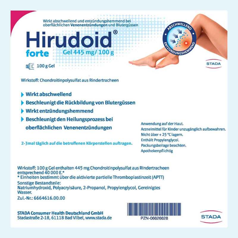 HIRUDOID® FORTE Gel 445 mg/100 g. Wirkstoff: Chondroitinpolysulfat aus Rindertracheen. Zur lokalen Behandlung von stumpfen Verletzungen (Traumen) mit und ohne Bluterguss (Hämatom), oberflächlicher Venenentzündung, sofern diese nicht durch Druck von Außen (Kompression) behandelt werden kann. Enthält Propylenglycol. Zu Risiken und Nebenwirkungen lesen Sie die Packungsbeilage und fragen Sie Ihre Ärztin, Ihren Arzt oder in Ihrer Apotheke. STADA GmbH, Stadastraße 2-18, 61118 Bad Vilbel. Stand: Juni 2013