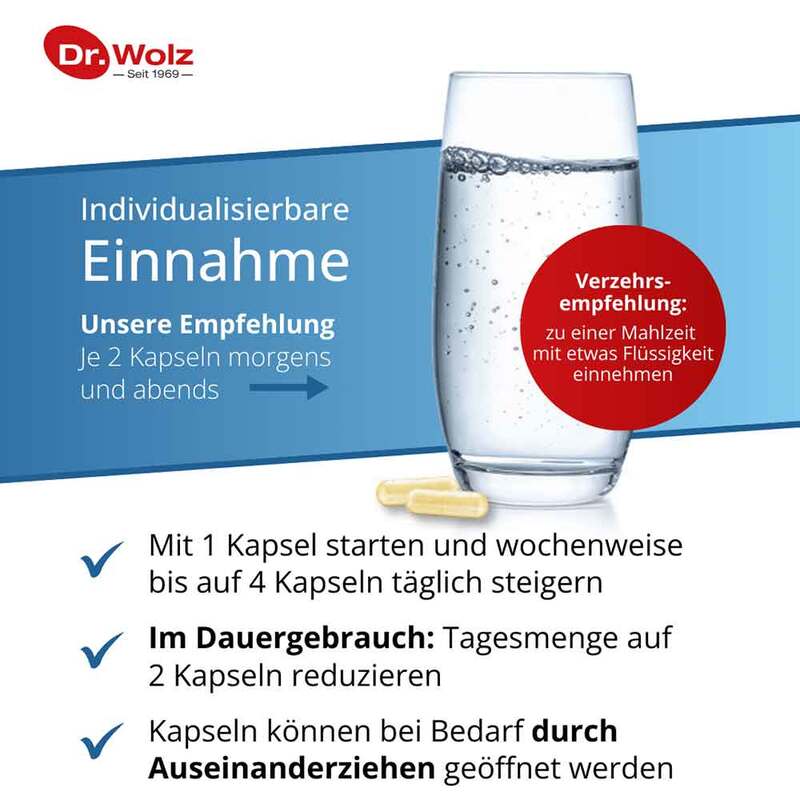 Nehmen Sie 4 Kapseln täglich zu den Mahlzeiten mit Flüssigkeit ein. Im Dauergebrauch kann die Tagesmenge auf 2 Kapseln reduziert werden.