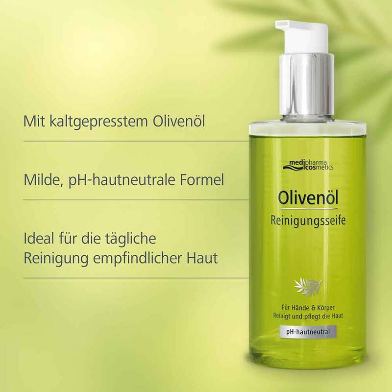 Die mild reinigende Olivenöl Reinigungsseife verwöhnt den ganzen Körper, ohne die Haut auszutrocknen. Die wertvolle Kombination mit kaltgepresstem Olivenöl, hautfreundlichen Waschsubstanzen und pflegendem Panthenol. Entfernt sanft Make-up, schützt die Haut vor dem Austrocknen. Pflegt und regeneriert die Haut.