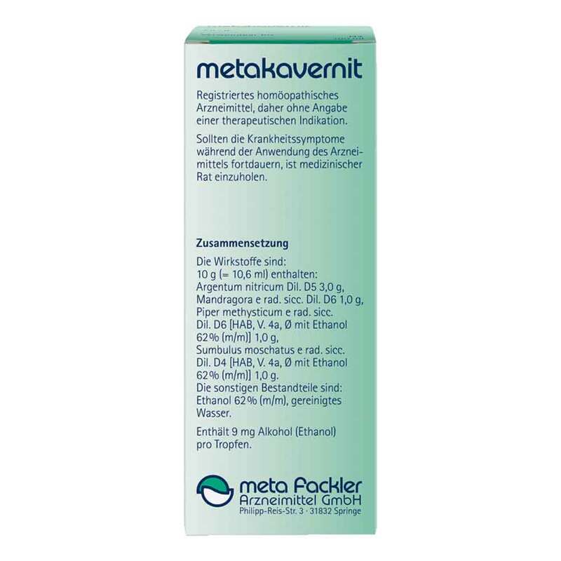 Pflichtangaben:metakavernit Mischung. Anwendungsgebiete: Registriertes homöopathisches Arzneimittel, daher ohne Angabe einer therapeutischen Indikation. Enthält 9 mg Alkohol (Ethanol) pro Tropfen. Zu Risiken und Nebenwirkungen lesen Sie die Packungsbeilage und fragen Sie Ihre Ärztin, Ihren Arzt oder in Ihrer Apotheke. meta Fackler Arzneimittel GmbH, D-31832 Springe.