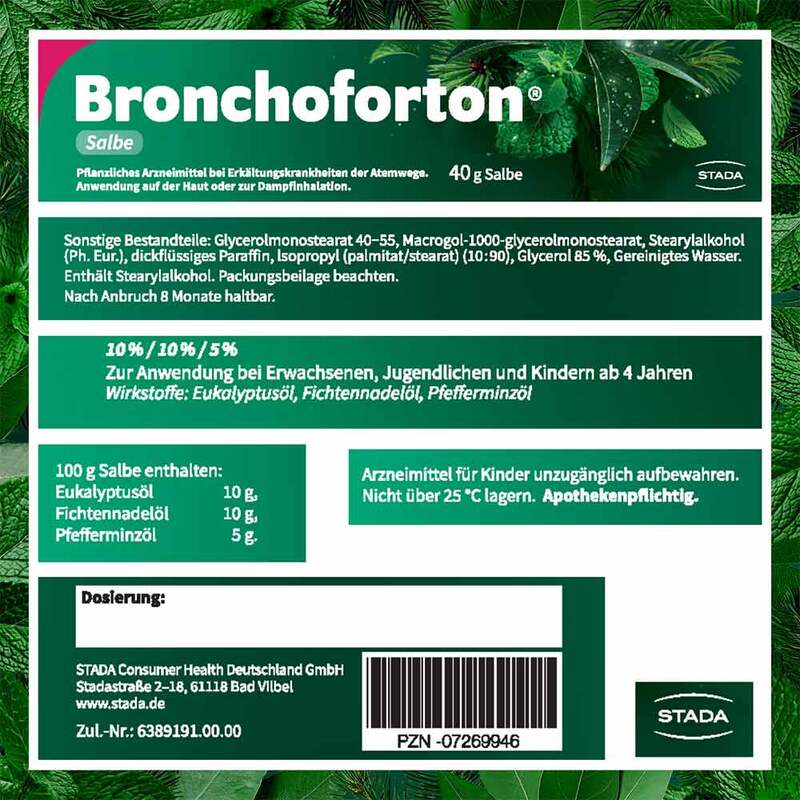 Bronchoforton® Salbe10%/10%/5% Zur Anwendung bei Kindern ab 4 Jahren und Erwachsenen Wirkstoffe: Eukalyptusöl, Fichtennadelöl, Pfefferminzöl. Zur Inhalation und äußerlichen Anwendung zur Besserung der Beschwerden bei Erkältungskrankheiten der Atemwege mit zähflüssigem Schleim. Hinweis: Enthält Stearylalkohol. Zu Risiken und Nebenwirkungen lesen Sie die Packungsbeilage und fragen Sie Ihre Ärztin, Ihren Arzt oder in Ihrer Apotheke. STADA Consumer Health Deutschland GmbH, Stadastraße 2-18, 61118 Bad Vilbel Stand: März 2022