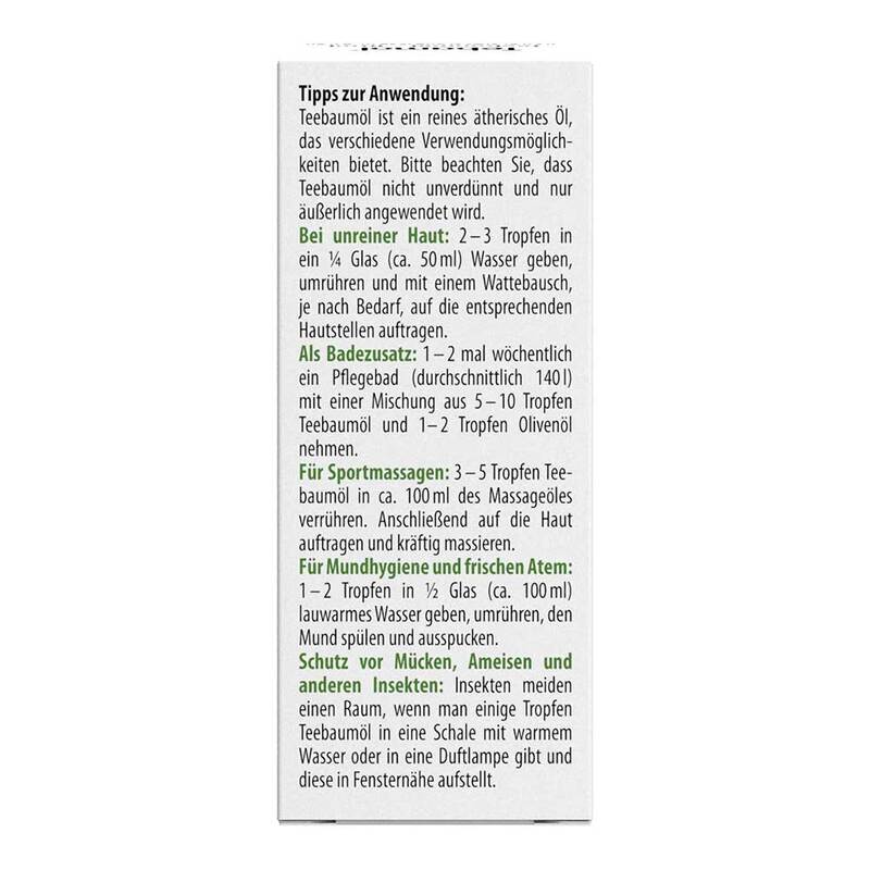 Zur Pflege trockener Haut: 1 – 2 mal wöchentlich ein Pflegebad (durchschnittlich 140 l) mit einer Mischung aus 5 – 10 Tropfen Teebaumöl und 1 – 2 Tropfen Olivenöl nehmen.