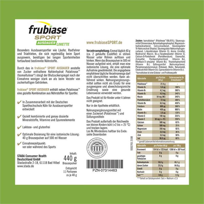 Schon mit einer Portion (40 g) des Frubiase Sport Ausdauer Brausepulvers mit frischem Limettengeschmack vor oder während des Sports können ambitionierte Ausdauersportler den Körper mit allen wichtigen Nährstoffen versorgen und gleichzeitig den Blutzuckerspiegel während Training und Wettkampf stabil halten.*