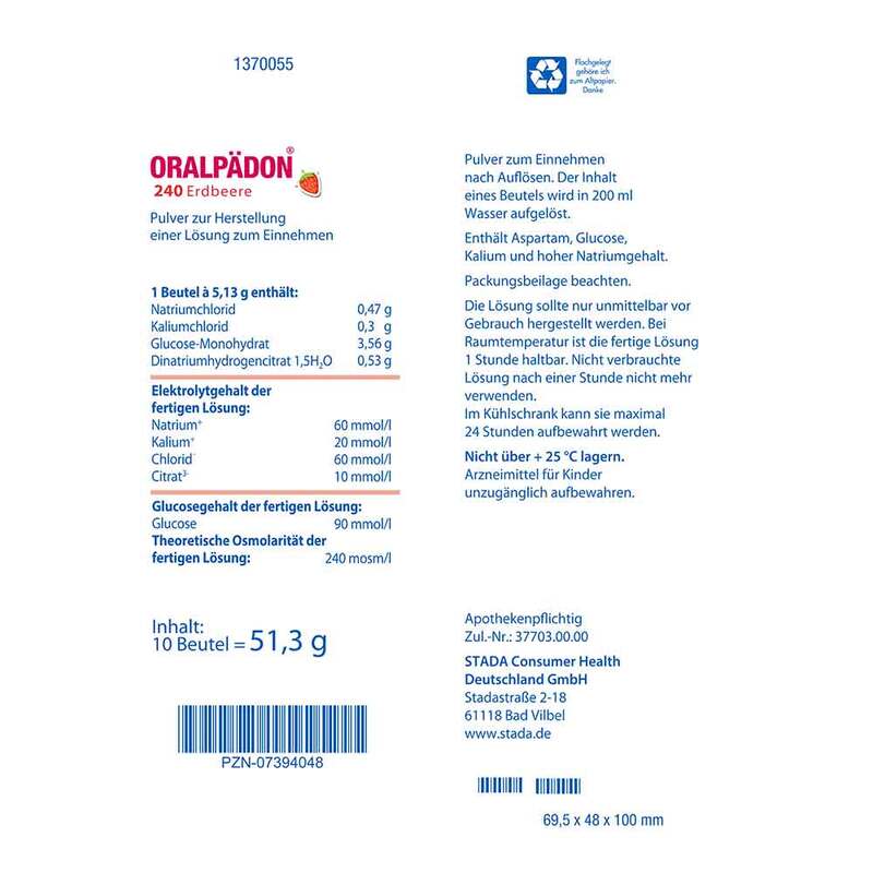 Oralpädon® 240 Erdbeere Pulver zur Herstellung einer Lösung zum Einnehmen Wirkstoffe: Natriumchlorid, Kaliumchlorid, Glucose-Monohydrat, Dinatriumhydrogencitrat 1,5 H2O. Zur oralen Salz- (Elektrolyt-) und Flüssigkeitszufuhr (Ausgleich von Salz- und Wasserverlusten) bei Durchfallerkrankungen. Hinweise: Jeder Durchfall kann Anzeichen einer schweren Erkrankung sein. Bei längerer Dauer und/oder Beeinträchtigung des Allgemeinbefindens ist daher unverzüglich ein Arzt aufzusuchen. Insbesondere bei Säuglingen und Kleinkindern können Durchfälle, besonders bei gleichzeitigem, unstillbarem Erbrechen, rasch zu schweren Krankheitserscheinungen (Bewusstseinstrübung, Schock) führen. Es ist daher bei der Durchfallbehandlung von Säuglingen und Kleinkindern in jedem Fall ein Arzt hinzuzuziehen. Enthält Glucose, Kaliumchlorid, Natriumverbindungen und Aspartam. Zu Risiken und Nebenwirkungen lesen Sie die Packungsbeil age und fragen Sie Ihren Arzt oder Apotheker. STADA Consumer Health Deutschland GmbH, Stadastraße 2–18, 61118 Bad Vilbel. Stand: September 2019