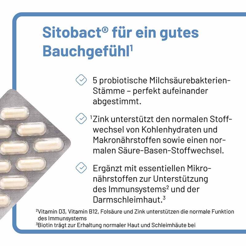 Sitobact enthält einen aufeinander abgestimmten Mix von fünf Stämmen probiotischer Milchsäurebakterien. Die Milchsäurebakterien sind dabei für die Magenpassage besonders „verpackt“, damit sie lebend in den Darm gelangen. Mit dem zugefügten Präbiotikum Inulin wird gleichzeitig die Ernährung der zugeführten Milchsäurebakterien sichergestellt. Darüber hinaus enthält Sitobact die essentiellen Mikronährstoffe Zink, Folsäure, Vitamin D3 und Vitamin B12, um so zusätzlich die Funktion des Immunsystems zu unterstützen.